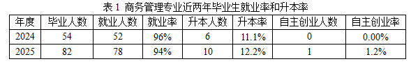 本专业近两年平均就业率均在95%以上,2025年商务管理专业专升本率为12.2%。