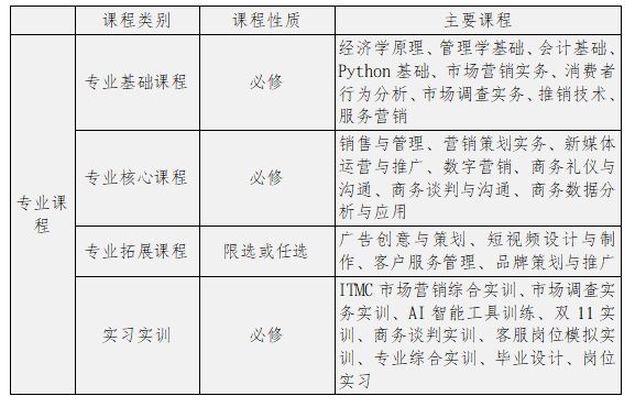 本专业培养德智体美劳全面发展,掌握扎实的科学文化基础和市场分析、商品销售、客户服务及相关法律法规等知识,具备用户画像、项目销售、数字营销、品牌策划、市场推广、智能客户服务、商务数据分析等能力,具有工匠精神和信息素养,面向批发业、零售业等行业的市场营销专业人员、客户服务管理员、互联网营销师、品牌专业人员等职业(群),能够从事市场调查专员、销售专员、营销策划专员、市场推广专员、客服专员等岗位的工作,毕业3~5年能够胜任市场策划主管、推广主管、销售业务主管、客户服务主管等工作的高素质技术技能人才。近三年毕业生就业率均保持在93%以上,就业质量稳定;2023—2025届升学率分别为8.1%、13.7%、16.5%,升学成效显著;近三年1名学生自主创业,整体形成“稳就业、优升学、重成长”的育人特色。
