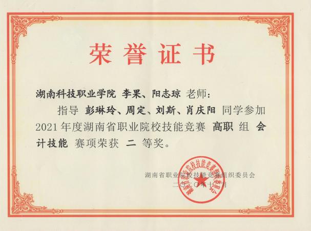 2020-2021年学生参加职业院校技能竞赛二等奖证书
