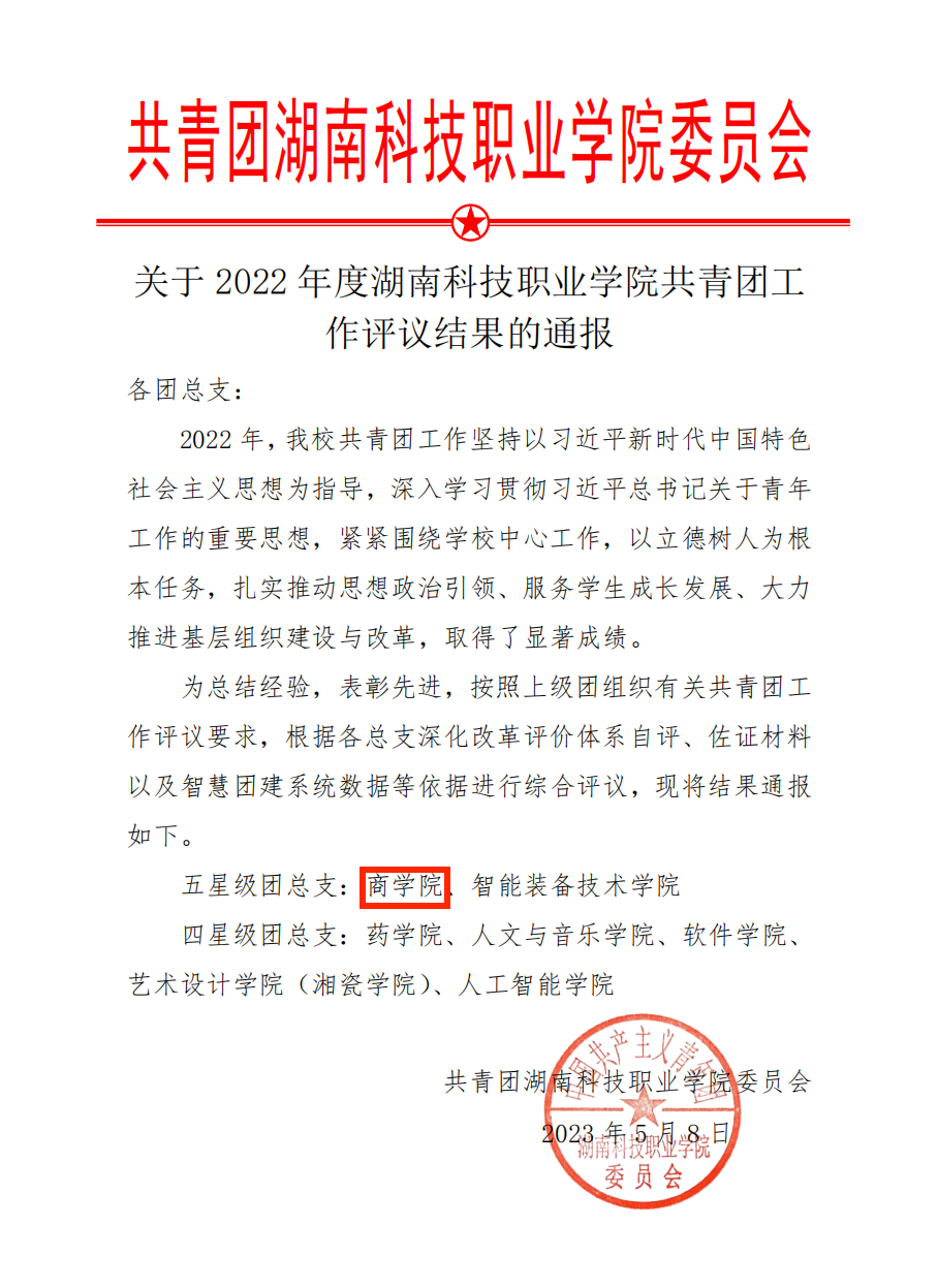喜报!我院在2022年度湖南科技职学院共青团工作评议被评为五星级团总支