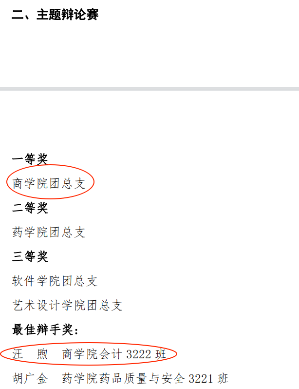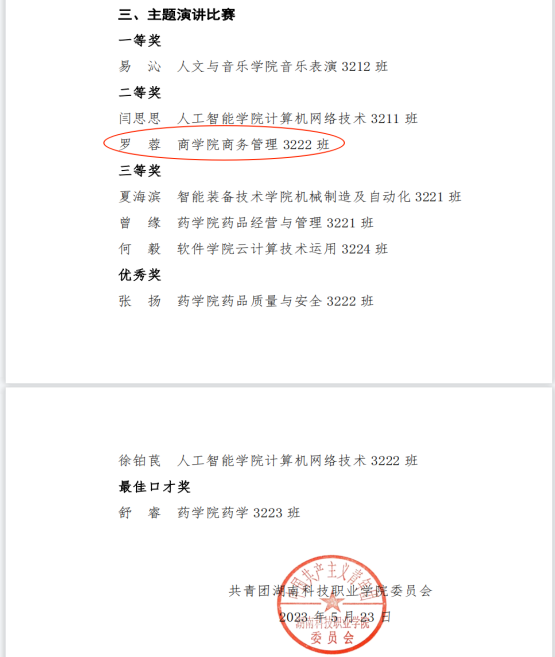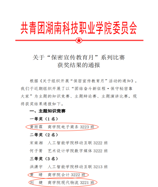 在同学们的积极配合下,商学院团总支在“保密宣传教育月”系列比赛中的主题辩论赛中荣获一等奖;我院电子商务3223班黄雨霖在主题知识竞赛中荣获一等奖,会计3222班黄晴、现代物流3221班刘婕在主题知识竞赛中荣获三等奖;我院会计3222班汪煦荣获“最佳辩手奖”;我院商务管理3222班罗蓉在主题演讲比赛中荣获二等奖。