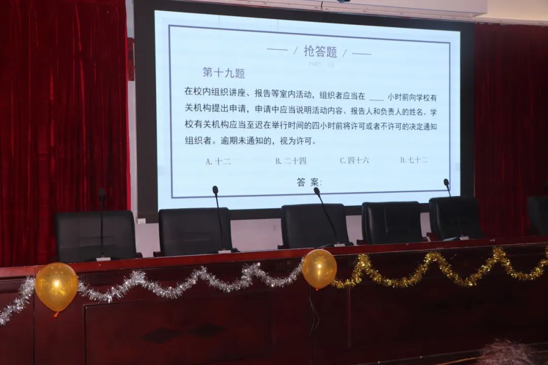 由商学院团总支学生会主办,商学院团总支学生会办公室承办的“校情校规知识竞赛”于2023年11月7日19:00在商学院大楼的多功能报告厅举行。