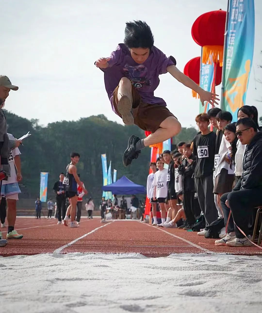 助跑,起跳!运动健儿纵身一跃,腾空而起,拿下惊人成绩,双脚落下,“彩虹”出现了,这是青春与运动的碰撞。