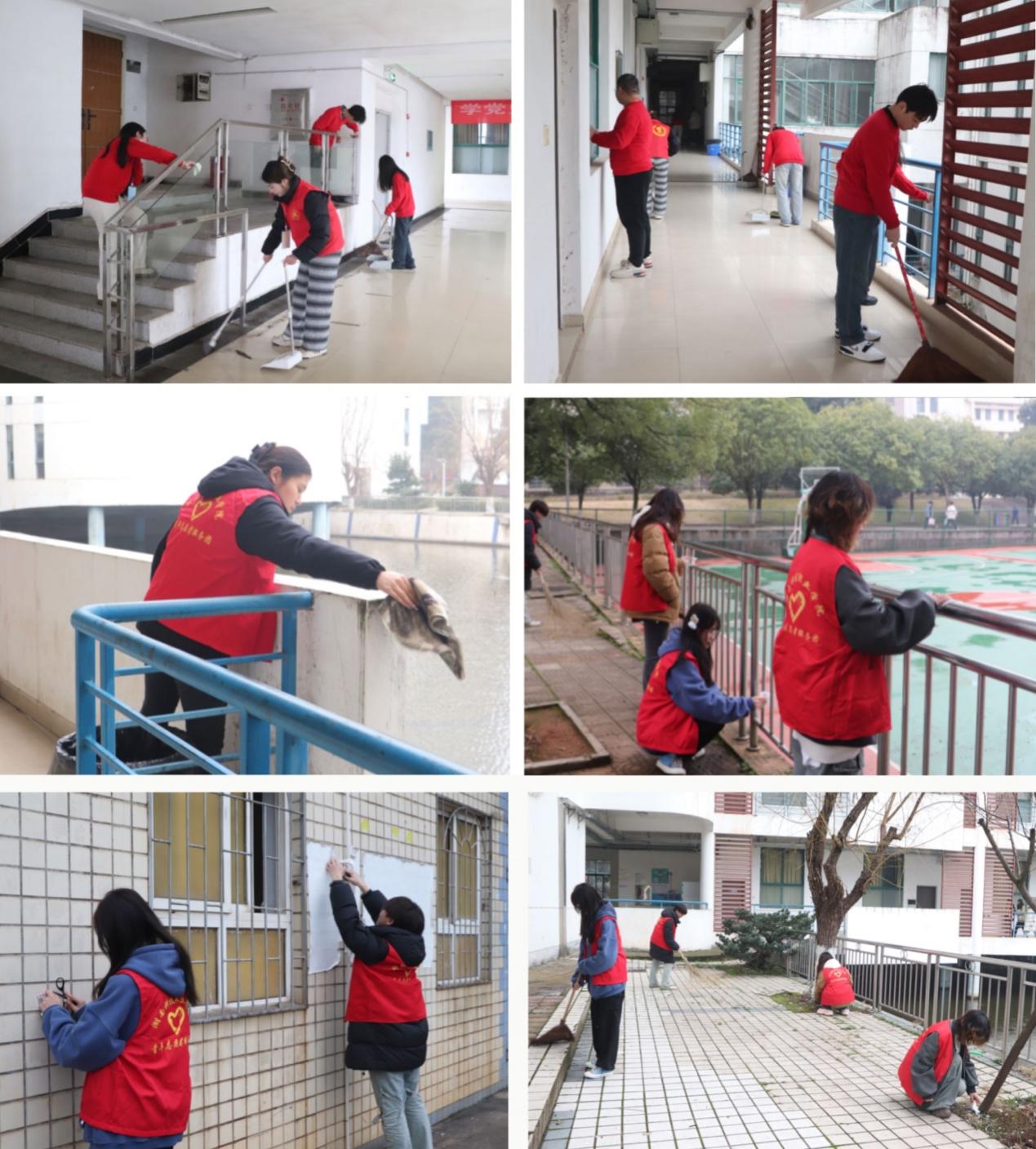 活动中,大家手持扫帚、抹布等清洁工具,对商学院大楼及周边公共区域的楼梯、护栏、门窗、宣传橱窗和走廊等进行了仔细的清洁,特别是对存留在卫生死角的一些饮料瓶、塑料管、烟头、树枝等进行了彻底清理。大家相互配合,分工明确,齐心协力,充分发挥“不怕累,不怕脏”的精神,一抹抹亮丽的“志愿红”成为校园里一道最亮丽的风景。经过近三个小时的打扫,在志愿者们的齐心协力下,商学院大楼公共区域环境焕然一新,看起来干净、整洁、赏心悦目。