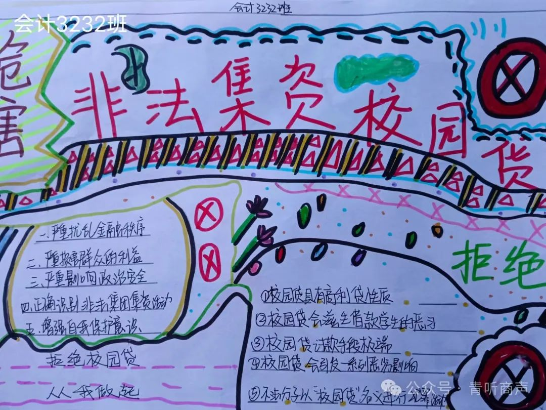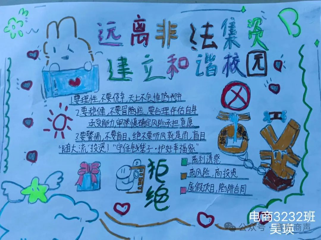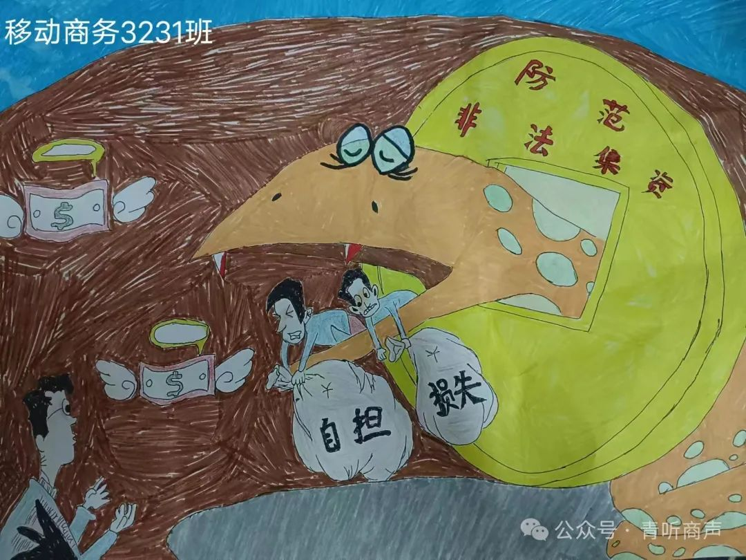 绘制防线,远离诈骗。在举办的“防范非法集资”主题手绘比赛中,我们鼓励参赛者用画笔生动地展现非法集资的陷阱与危害,并通过简明易懂的文字解读法律条文,使复杂的法律知识变得亲切易懂。这样的直观表达方式有助于公众深刻认识到非法集资的严重后果,并深入理解其本质和特征,从而提升大家的防范意识。活动尾声,由各部门学长学姐进行总结性点评。最终,获取本次防范非法集资主题手绘比赛中获奖的班级和选手如下: