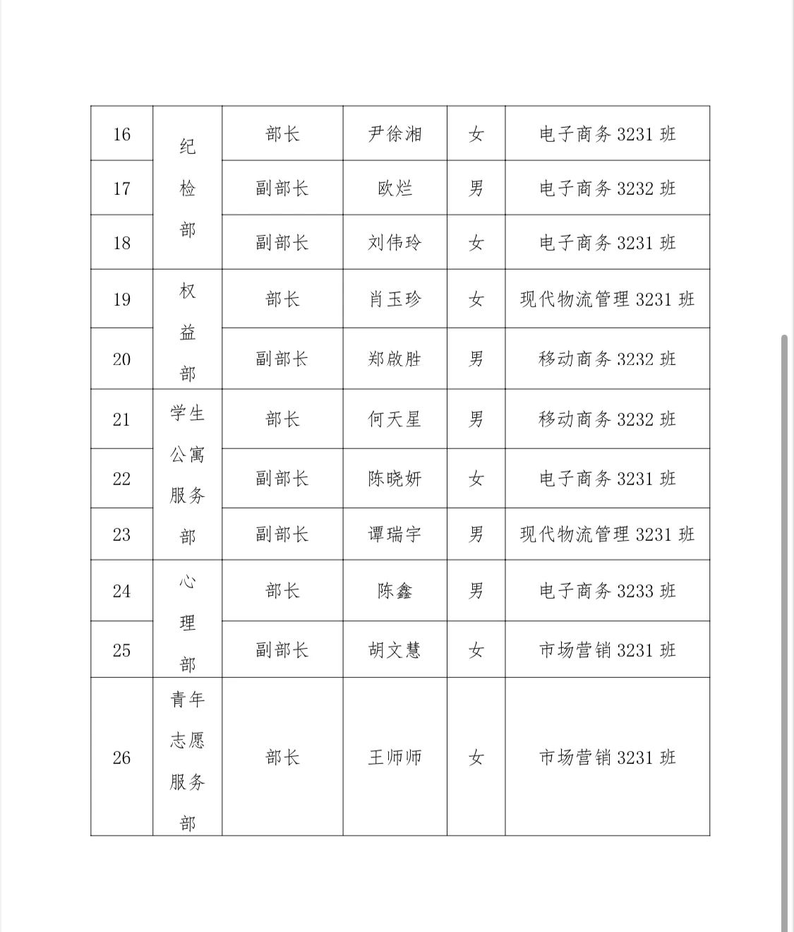 依据团总支、学生会工作需要,为持续强化学生干部队伍建设,根据《湖南科技职业学院学生干部管理办法(试行)》等文件要求,经个人申请、各团支部及部门推荐、公开竞选、面试考察等严格程序,商学院团总支研究决定,拟聘用胡文涛等 26 位同学担任团总支学生会各部门主要负责人。试用期为 1 个月。公示时间为 2024年 12 月 13 日-2024 年 12 月 18 日。