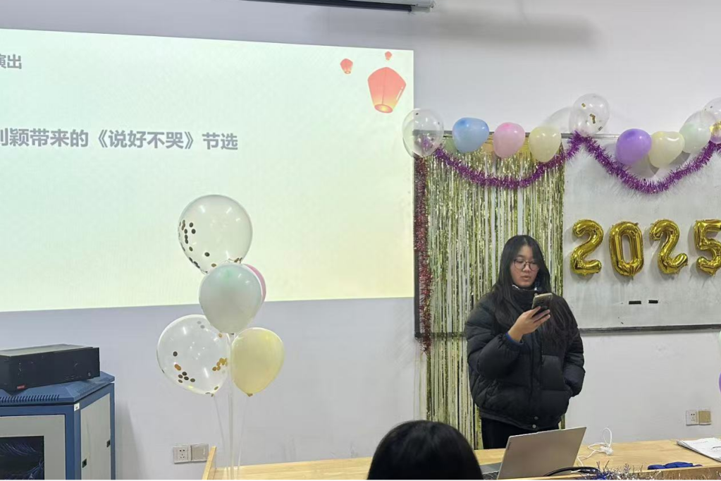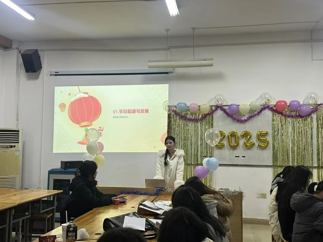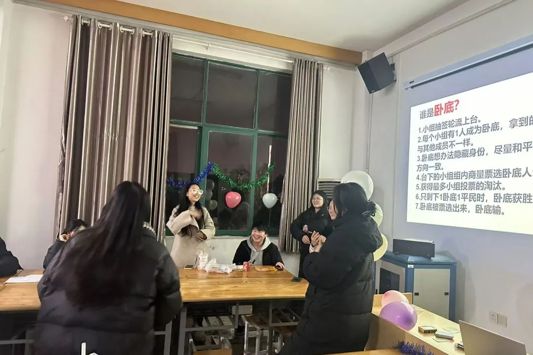 “击鼓传花“游戏把联欢会推向了高潮。同学们积极参与,现场气氛热烈。随着鼓声的起伏,花束在同学们手中快速传递,每个人脸上都洋溢着兴奋和紧张。