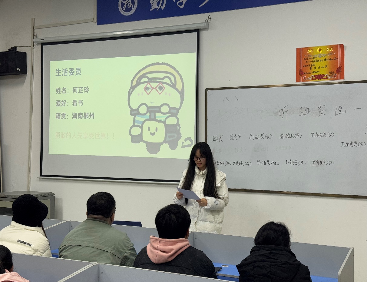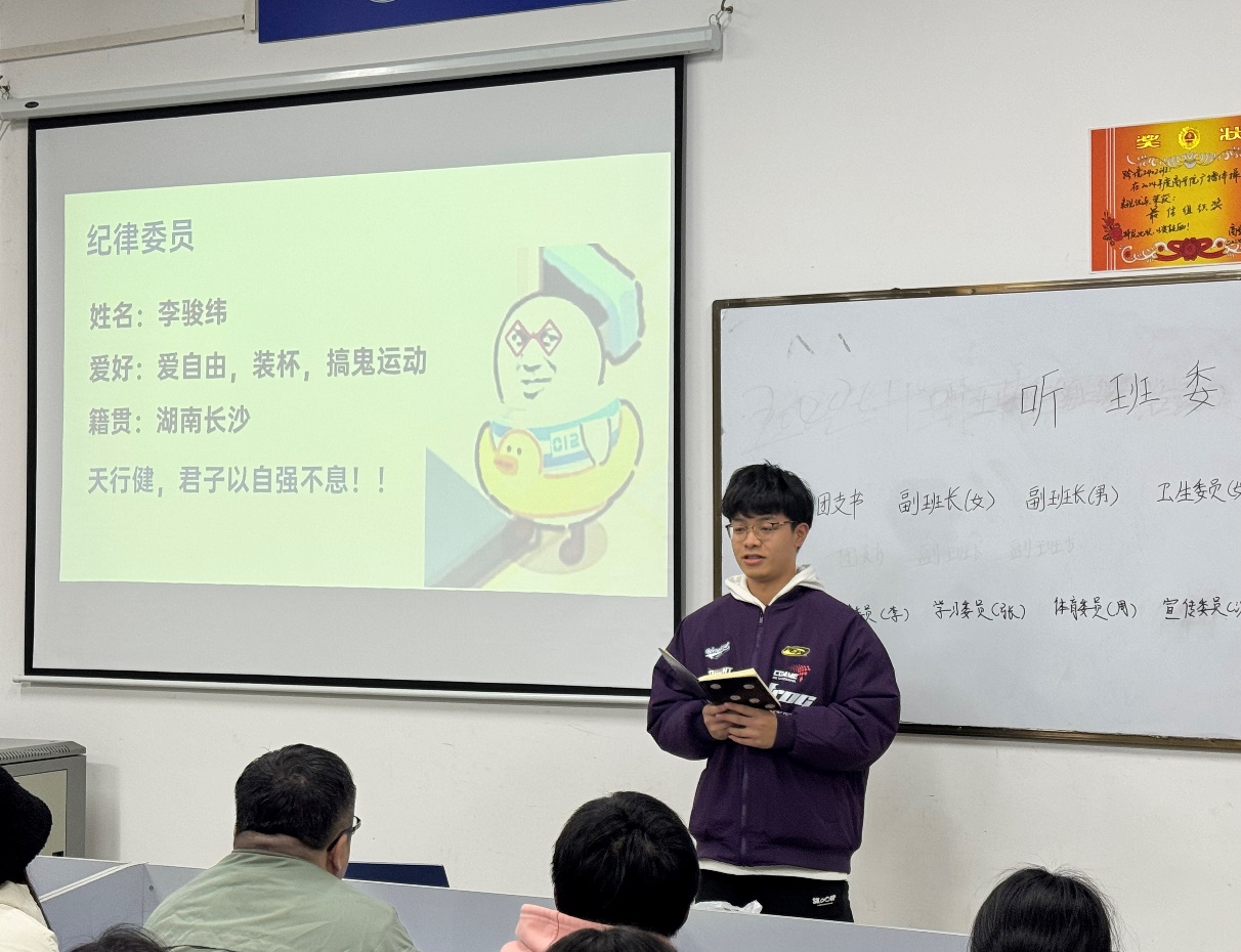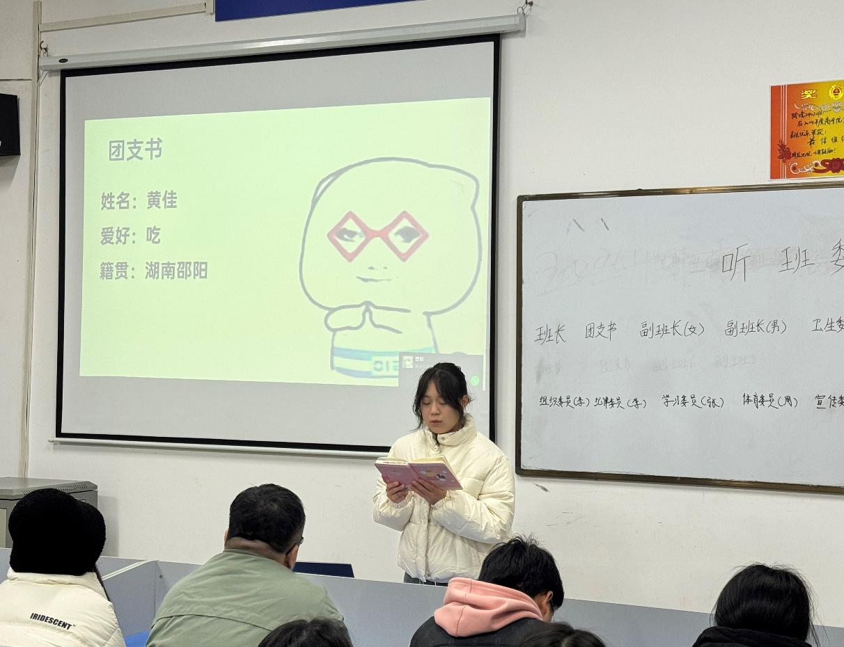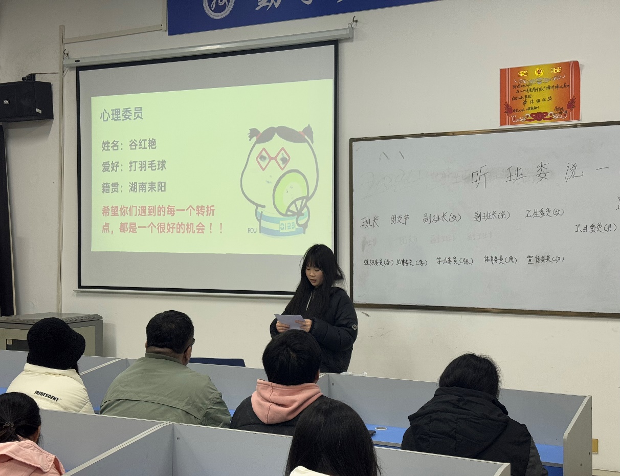 会议开始由团支书向大家介绍各班委的负责职务和自己的各项信息。接着,班委依次上台,就本学期的工作进行总结与反思,并对未来的工作进行规划。