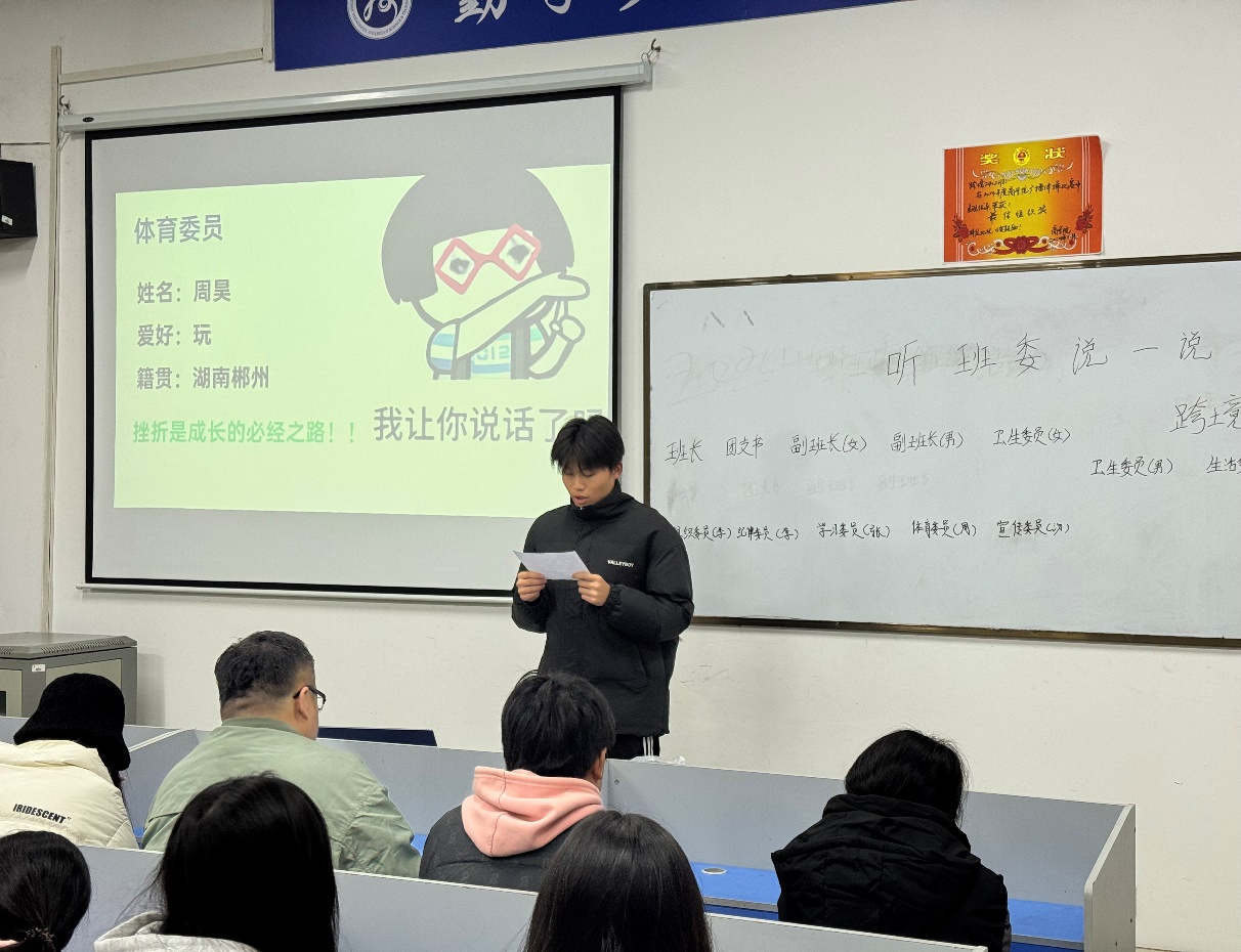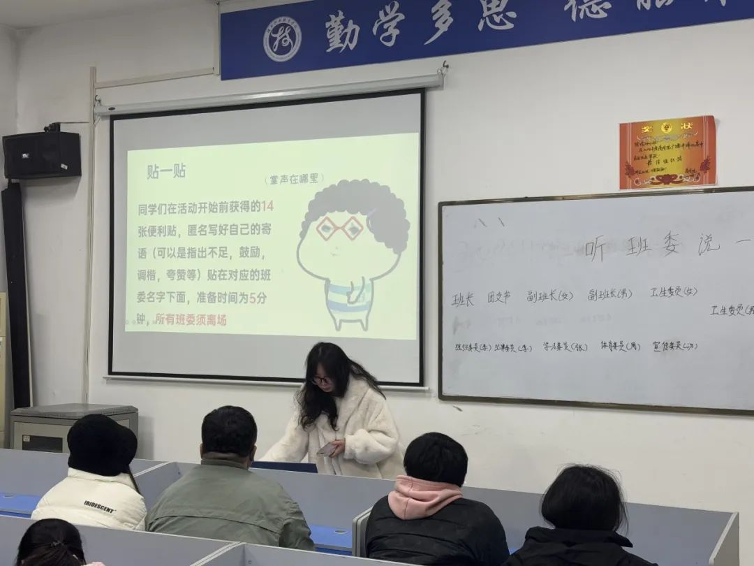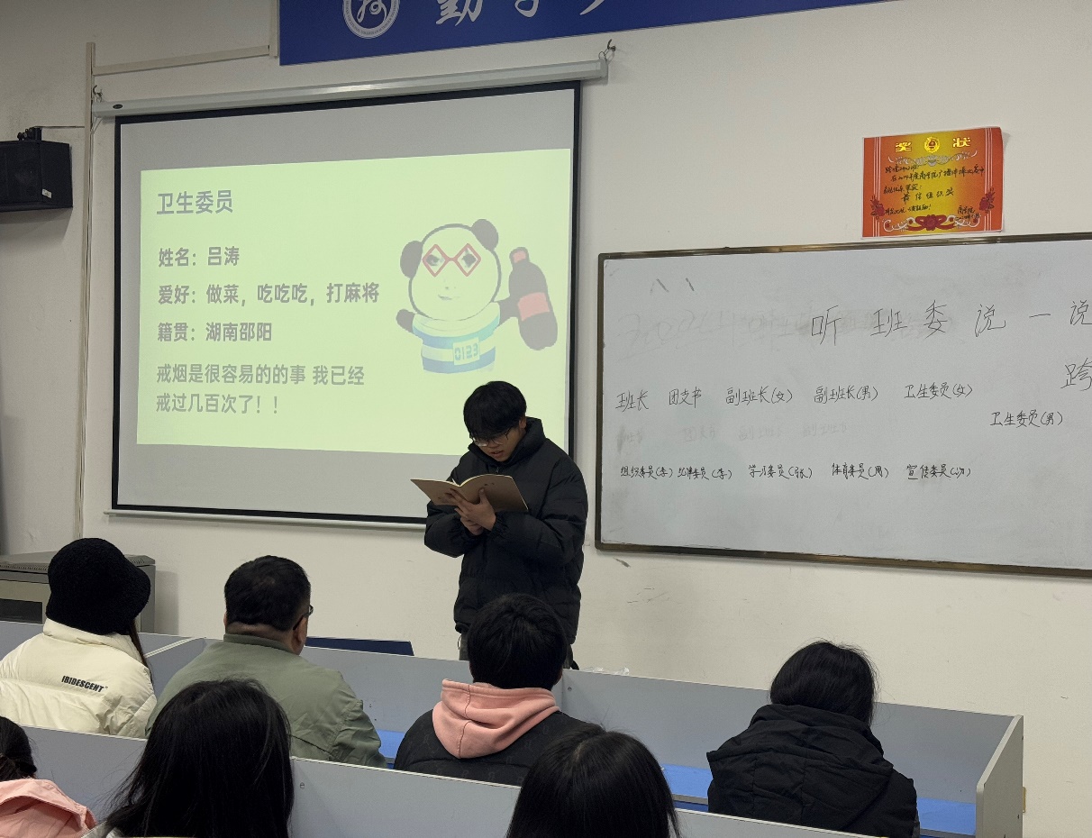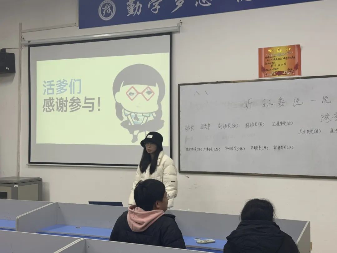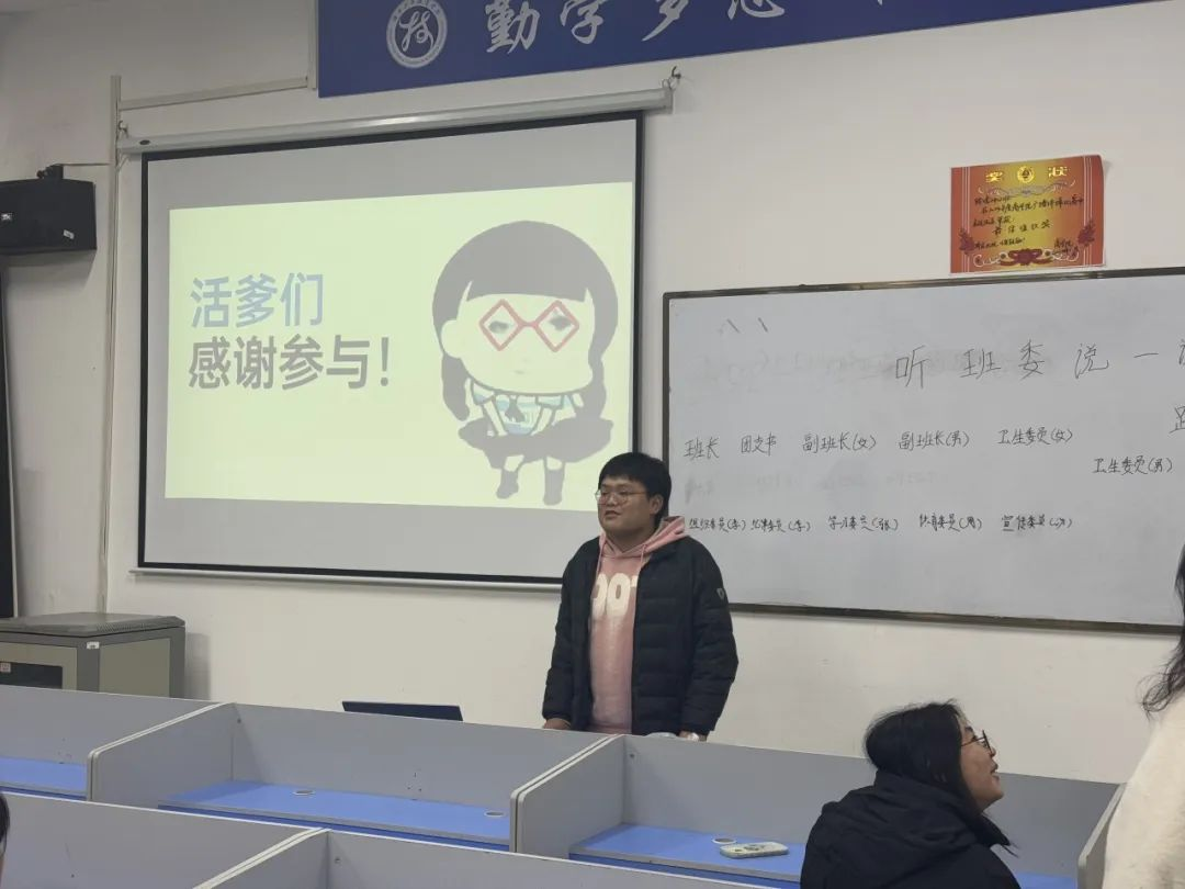 为了加强班级建设、提高班级凝聚力、加强同学们与班委之间的沟通与了解。跨境电商2403班于2024年12月25日19:00 在商学院大楼5-307教室举办“听班委说一说”主题班会。