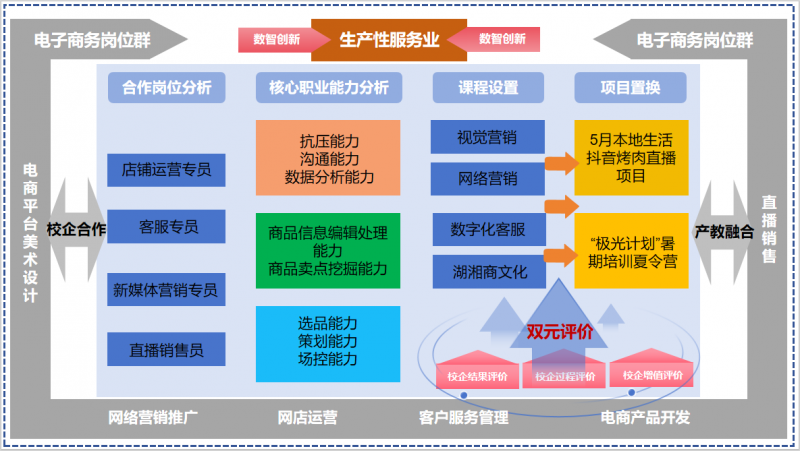 为解决以往校企合作中存在的问题,践行合理的人才培养方式,培养社会真正需要的人才。通过“引企入校”的方式,与长沙美育科技有限公司开展可持续性校企合作。为降低企业运营成本,减少企业培养人才的前期投入,确保合作能够为企业带来明确的利益,由学校为企业方提供培训场地,共同搭建校内直播间,校方专任教师与企业方技术人员共同商讨课程改革方式,推进“课程置换+双元评价”电子商务专业课程教学创新。校企双方共同研讨人才培养目标,根据现阶段学生所学理论知识及所具备的技能,结合岗位职业标准、技能要求、新技术对人才培养的要求,按照校方系统完善的教学机制,共同构建课程内容、制定评价标准并进行课程建设。企业方携带电子商务行业最新真实项目走进校园,与校方建立资源共享机制,开辟“双师课堂”,解决企业人才培养“效果差、吸收慢、成本高”等问题,减少学生抵触情绪,低成本高效率地为企业培养毕业即可上岗的技术型人才。