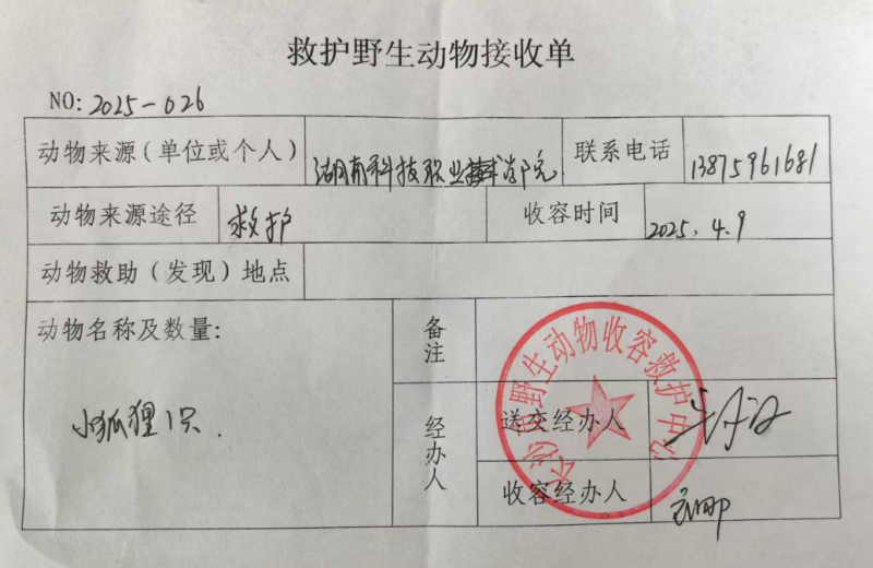 在将小动物带到辅导员办公室后,经仔细观察发现该小动物有着长长的大尾巴、犬科动物身形,全身雪白,外表特征与狐狸相似。并且它左前腿有明显骨折现象,因为疼得厉害全身发抖。朱老师将此情况报告了学院副书记冯志强,在了解详细情况后冯志强立即联系了长沙市野生动物园并安排老师陪同学生一起将小动物送往长沙市野生动物收容救护中心进行专业救治。