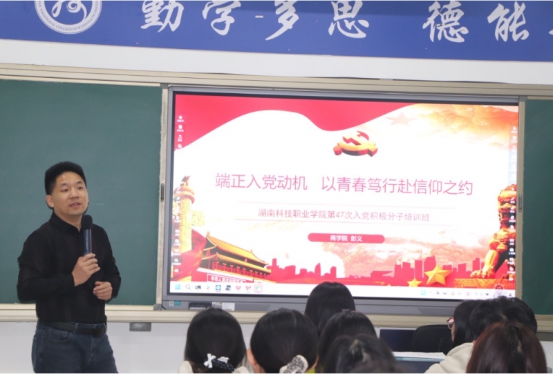 为深入学习贯彻习近平新时代中国特色社会主义思想,全面落实新时代党的建设总要求,引导入党积极分子端正入党动机、坚定理想信念。10月25日晚,商学院党总支书记彭义面向学院分党校第47期入党积极分子培训班学员,专题讲授“端正入党动机,以青春笃行赴信仰之约”党课,为青年学子厘清信仰方向、锚定入党初心。