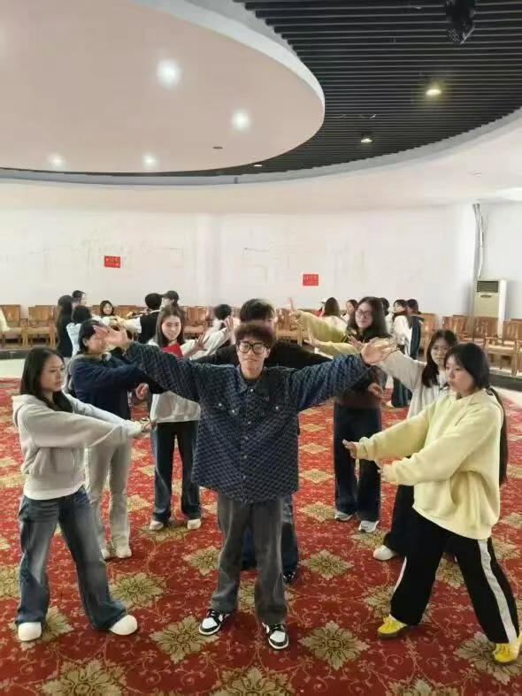 活动伊始,轻快音乐驱散拘谨,有同学主动献唱开启沟通。在陈老师引导下,同学们手拉手围成圈,指尖触碰打破异性与陌生同学间的交往边界。首个“跟我作对”游戏堪称“思维破冰”:主持人下达指令,同学们需做相反动作。有人因惯性出错,也有人突破认知精准完成,做错者通过才艺“受罚”,安慰奖的设置更让大家放下“怕出错”的心理负担。