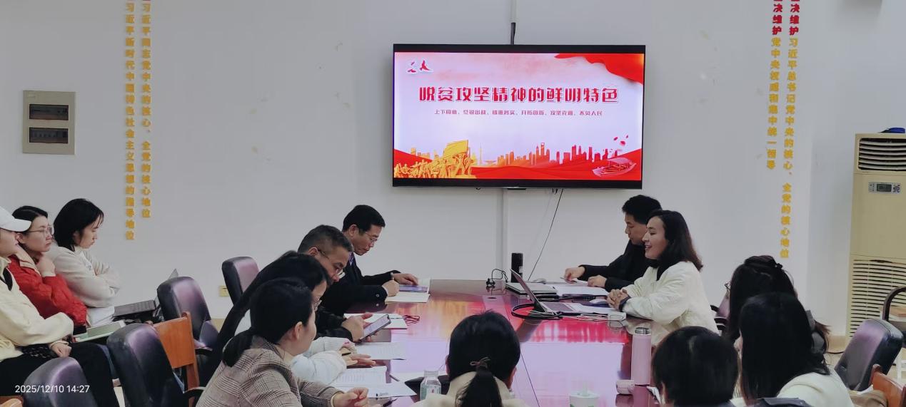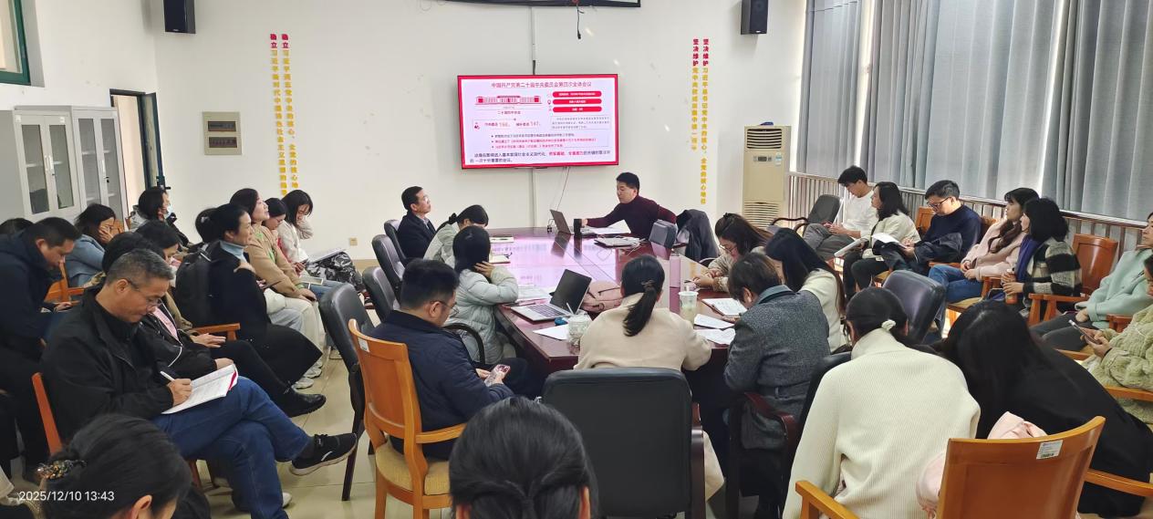为深入学习贯彻党的二十届四中全会精神,传承弘扬中国共产党人精神谱系,12月10日,商学院党总支组织全体教职工在商学院大楼五楼党员活动室召开党员大会暨专题宣讲会。本次活动以“理论武装+精神传承”双轮驱动,通过“领学+宣讲+研讨”三维模式,推动党的创新理论入脑入心,为学院高质量发展凝聚思想合力与行动自觉。