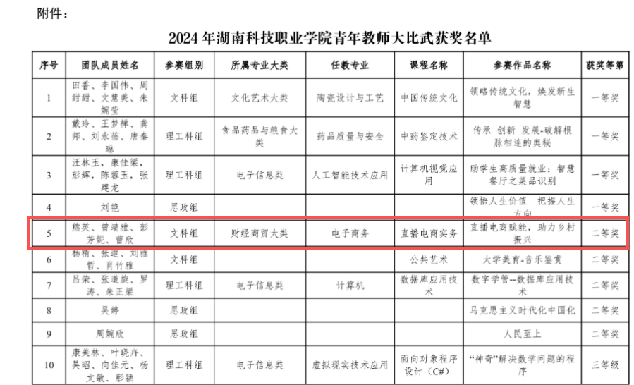 12 | 青年教师大比武 | 2024年湖南科技职业学院青年教师大比武荣获二等奖 | 熊英、曾靖雅、彭芳妮、曹欣 |