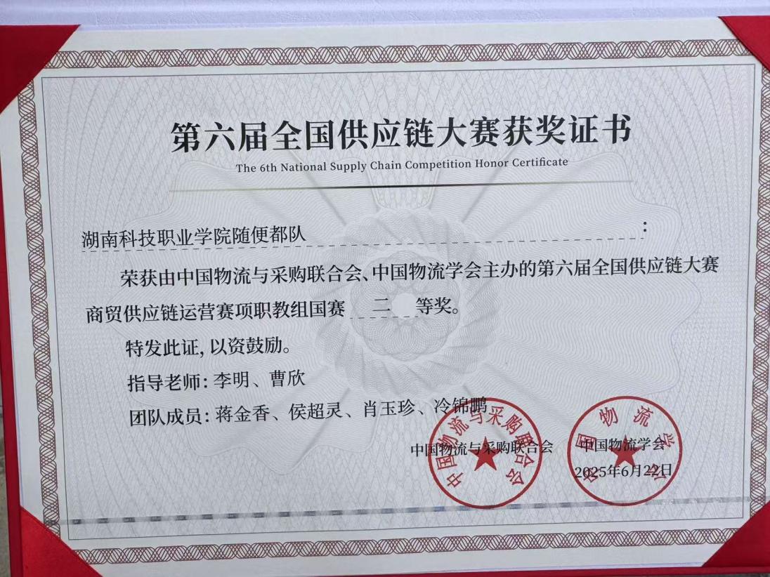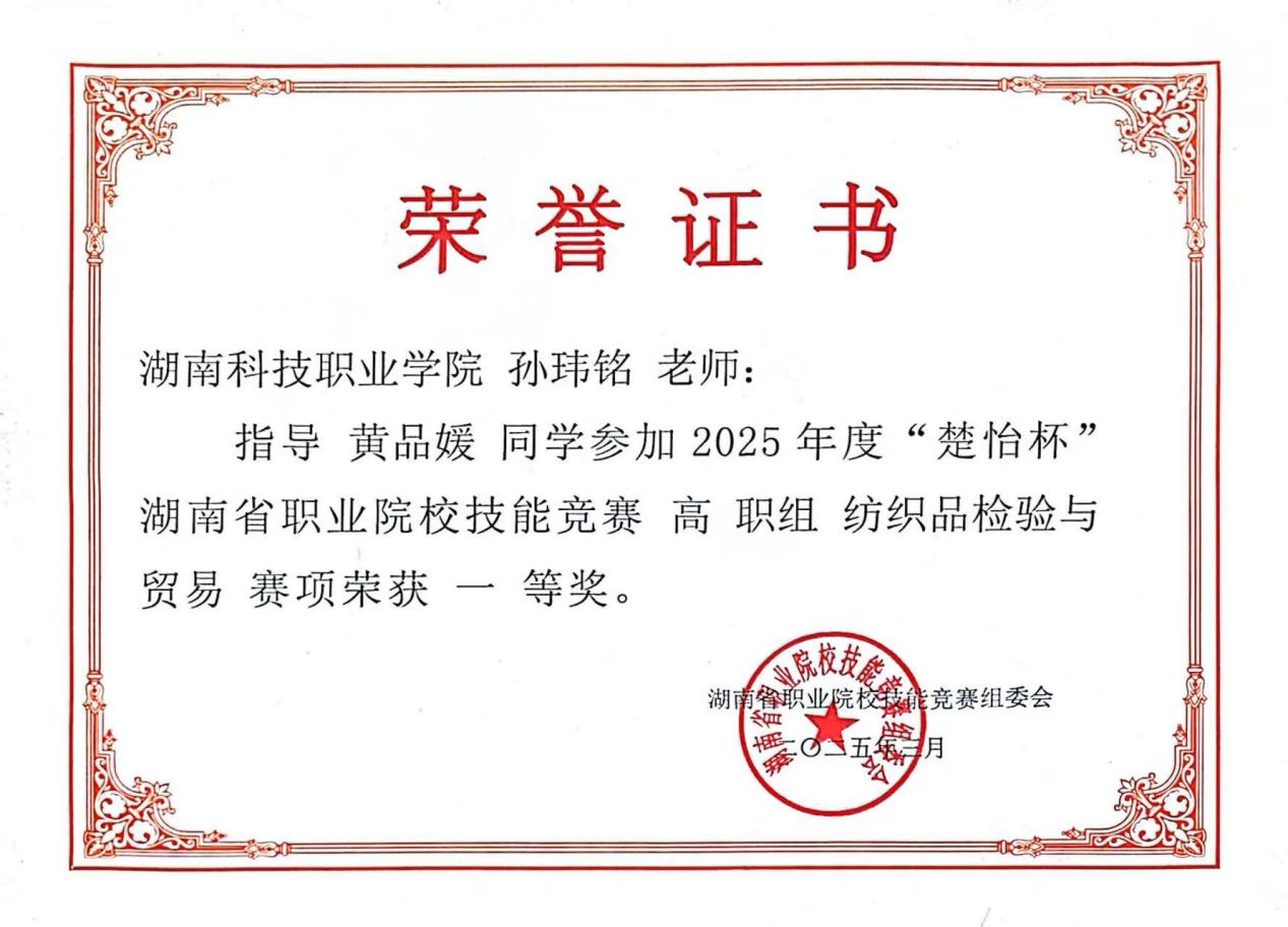3.孙玮铭指导学生参与2025年度“楚怡杯”湖南省职业院校技能竞赛高职组纺织品检验与贸易荣获一等奖