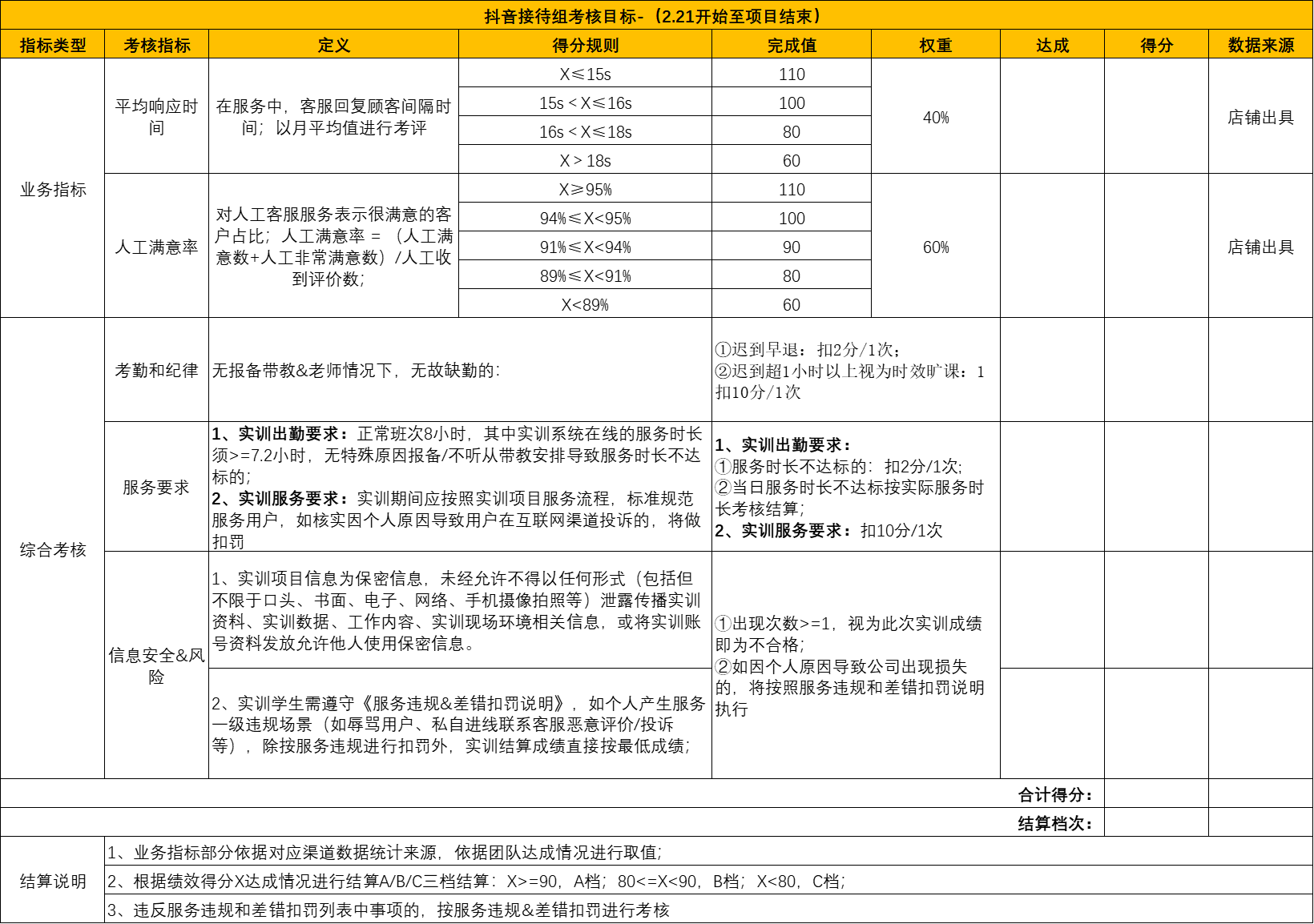 一是建立“平台数据+过程表现”的双元评价体系。在珀莱雅 38 大促项目中,企业依据天猫、抖音等电商平台对客服的考核规则,设置了平均响应时长、客户满意度、质检抽检成绩、售后解决率、邀评率等核心数据指标,并与出勤纪律、违规记录等过程性数据结合,形成了面向不同渠道的绩效评价表,将指标区间与等级评定、补助发放直接挂钩,实现了“用数据说话”的客观评价。学院则从职业形象、职业行为习惯、团队协作、学习主动性、任务完成度等维度进行综合评价,并将企业评价结果折算为课程成绩的一部分,形成“企业看业务、学校看成长”的双元视角。